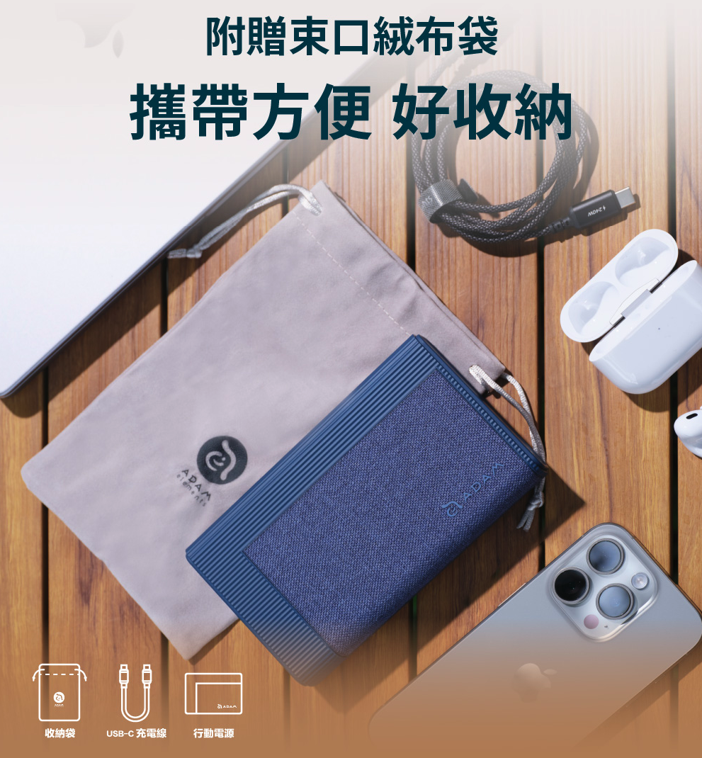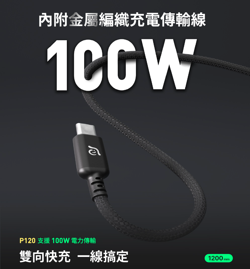 • 內附120cm 支援100W充電之高質感編織線材,附贈束口絨布袋,輕易收納。