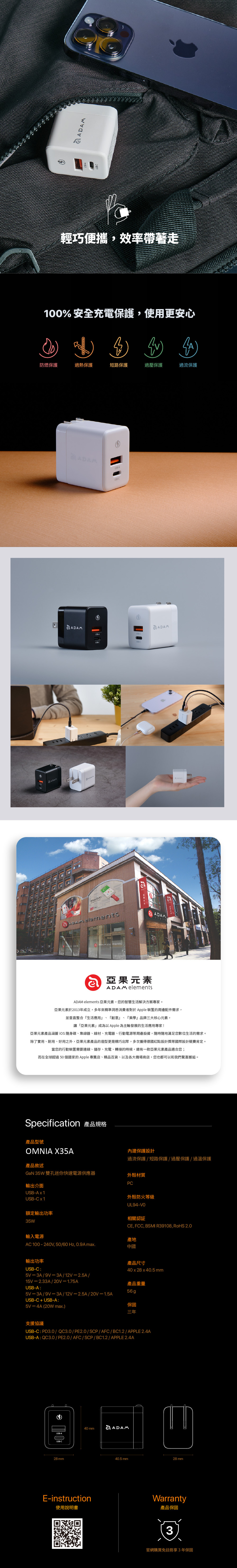 • USB-C (PD3.0)支援最高35W快充,USB-A (QC3.0)支援最高30W快充