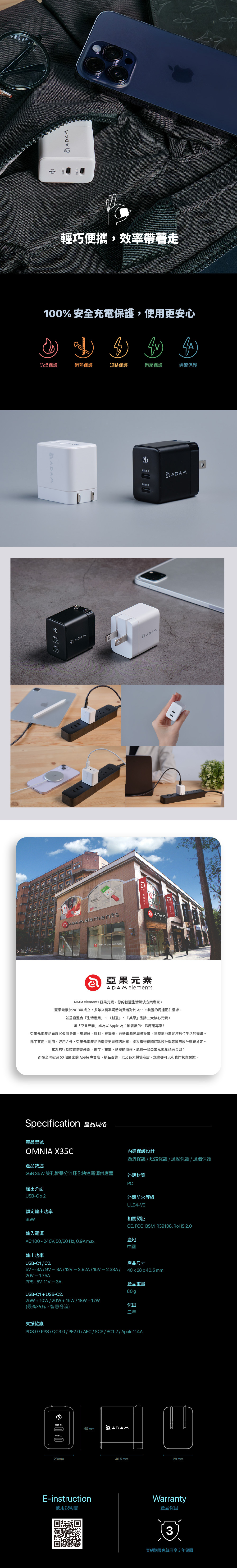 • USB-C (PD3.0)支援最高35W快充,USB-A (QC3.0)支援最高30W快充