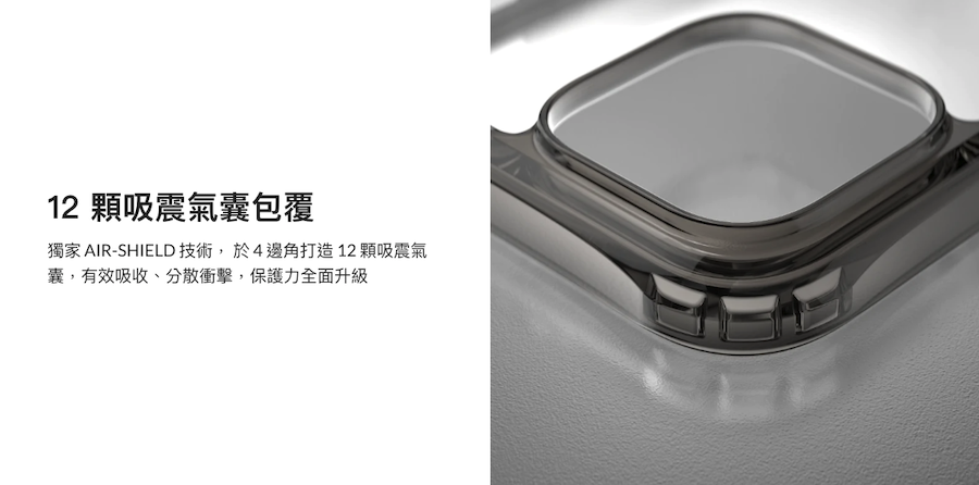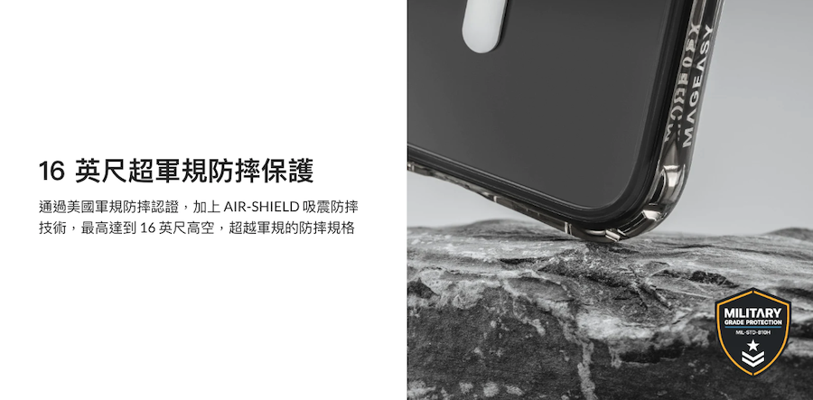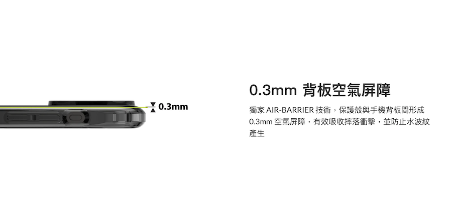 同時擁有 AIR-SHIELD 吸震氣囊技術、AIR-BARRIER 空氣屏障全方位包覆手機,達到 16 英尺超越軍規等級的防摔規格。