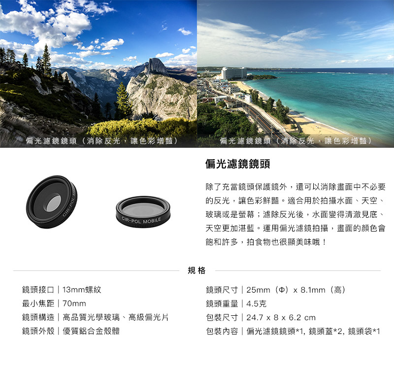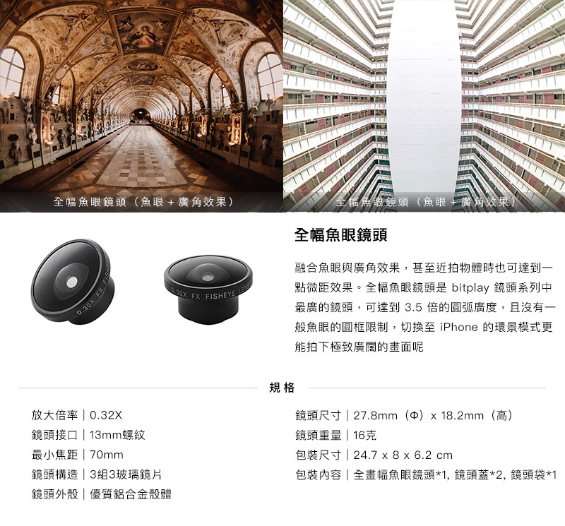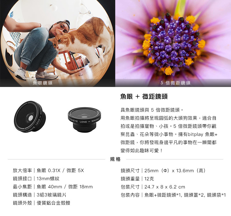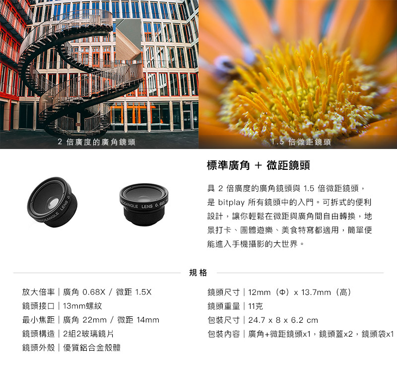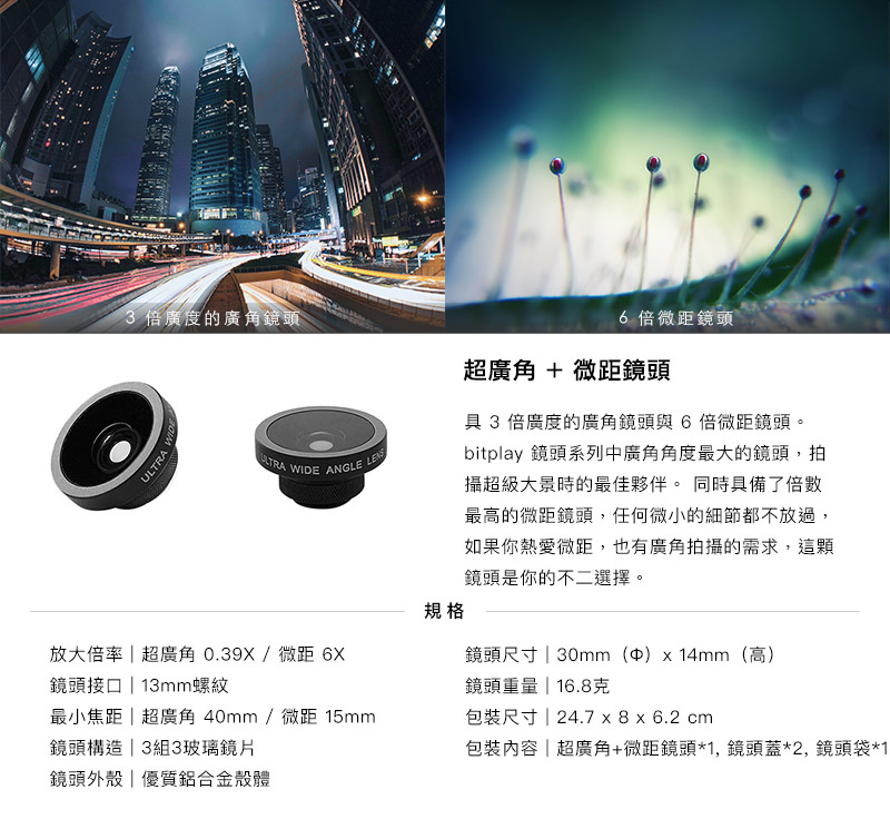 ✓ 放大倍率: 超廣角0.39X / 微距 6X ✓ 最小對焦距離:超廣角 40mm / 微距 15mm ✓ 鏡頭接口:13mm 螺紋 ✓ 內容物:超廣角+微距鏡頭*1, 鏡頭蓋*2, 鏡頭攜行軟袋*1 ✓自由搭配 bitplay 專用配件使用 |