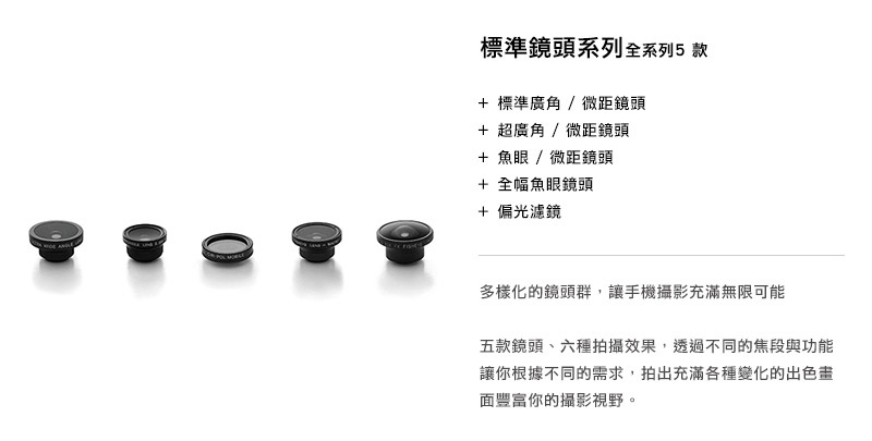 *此商品僅有超廣角+微距鏡頭(不含手機殼)* 需另購 SNAP 相機殼/ CLIP裸機鏡頭扣 搭配使用 |