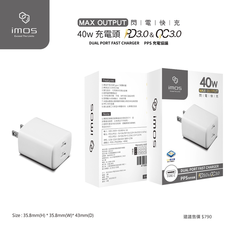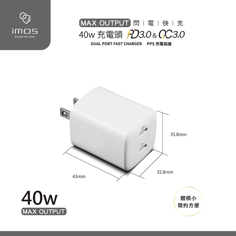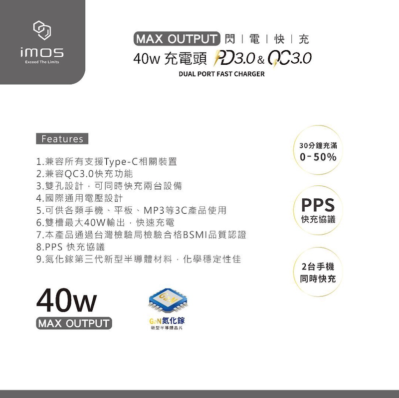 *此賣場為 imos PD3.0/QC3.0 40W 快充 *請認明原廠公司貨 *本公司為授權經銷商 ◈ 現貨商品,下單後 24 小時內出貨 ◈ 預購商品,出貨日以實際到貨為主 ● 本商品在非人為因素下,自購買起保固三年 |