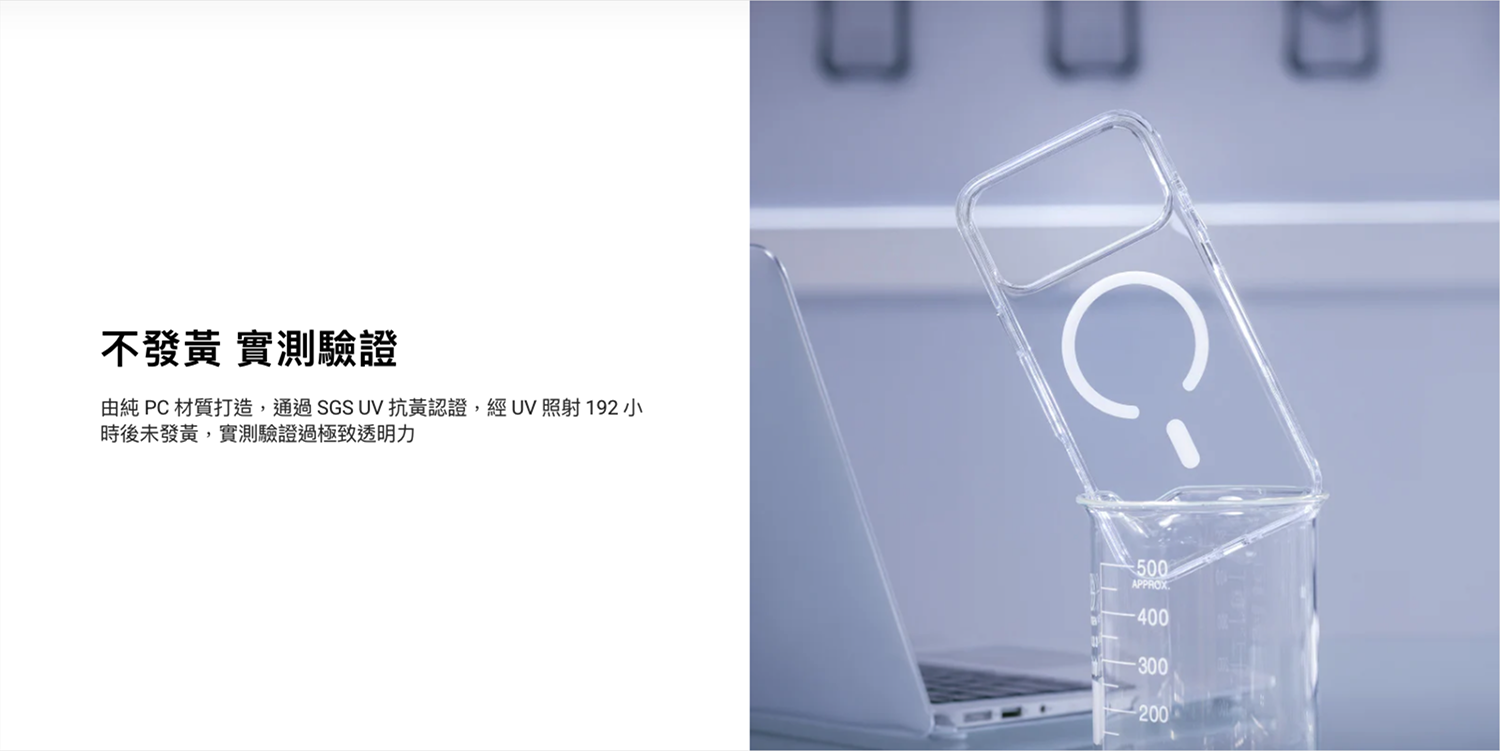 不發黃 實測驗證:由純 PC 材質打造,通過 SGS UV 抗黃認證,經 UV 照射 192 小時後未發黃,實測驗證過極致透明力