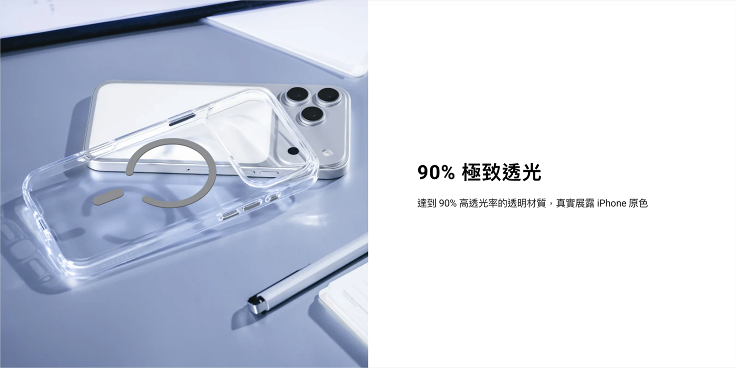 90% 極致透光:達到 90% 高透光率的透明材質,真實展露 iPhone 原色