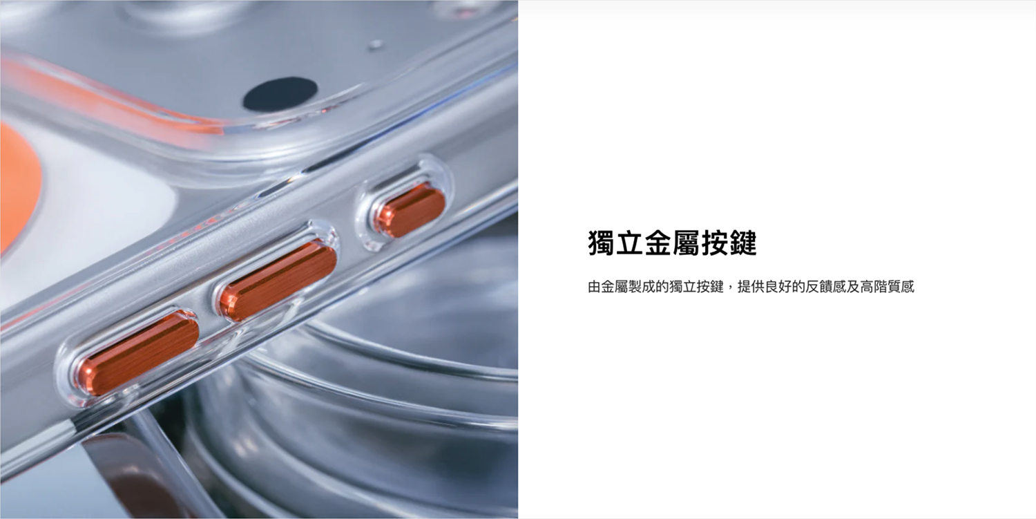 獨立金屬按鍵:由金屬製成的獨立按鍵,提供良好的反饋感及高階質感