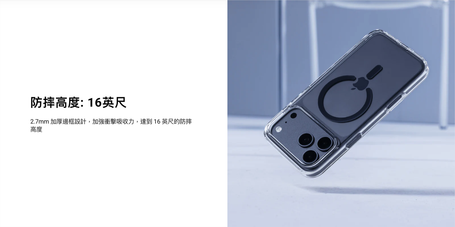 防摔高度:16 英尺:2.7mm 加厚邊框設計,加強衝擊吸收力,達到 16 英尺的防摔高度