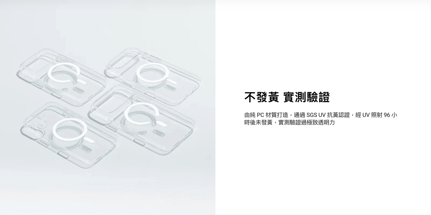 不發黃 實測驗證:由純 PC 材質打造,通過 SGS UV 抗黃認證,經 UV 照射 96 小時後未發黃,實測驗證過極致透明力