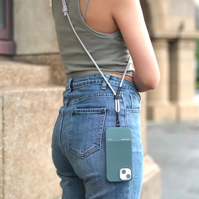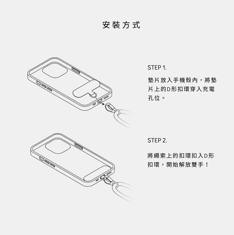 放上墊片,再將手機殼套上!殼體輕鬆連結、拆卸背繩!