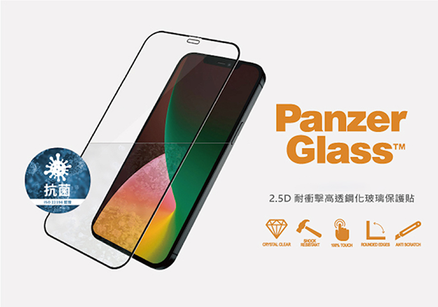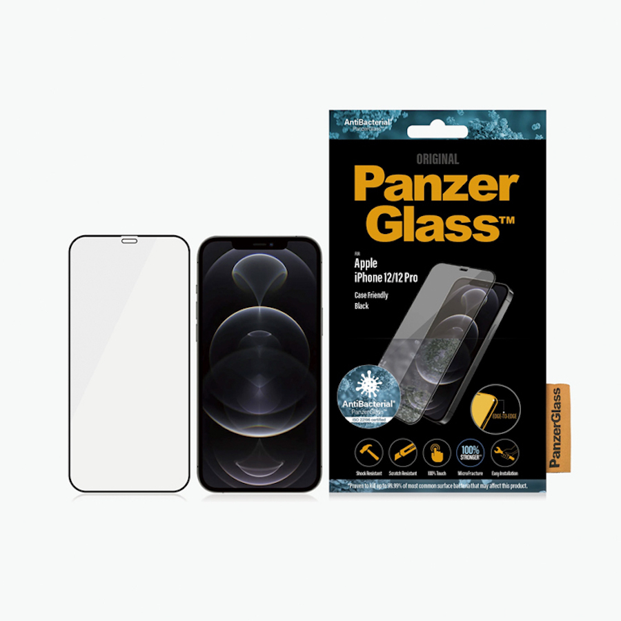 適用於iPhone的PanzerGlass™屏幕保護膜,適用於iPhone PanzerGlass™iPhone 12系列 抗菌黑色,帶有抗菌塗層,具有與原始PanzerGlass™相同的功能,可保護您的屏幕免受刮擦和碰撞,該玻璃杯塗有活性抗菌物質,可抵抗細菌和真菌的孢子,抗菌成分可殺死玻璃上的細菌和真菌孢子,並為用戶提供保護。