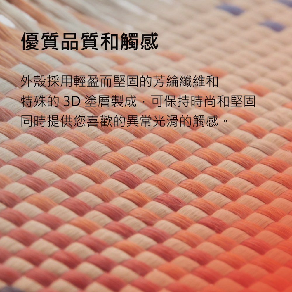 ‧ 外殼採用輕盈而堅固的芳綸纖維和特殊的 3D 塗層製成,可保持時尚和堅固,同時提供您喜歡的異常光滑的觸感。