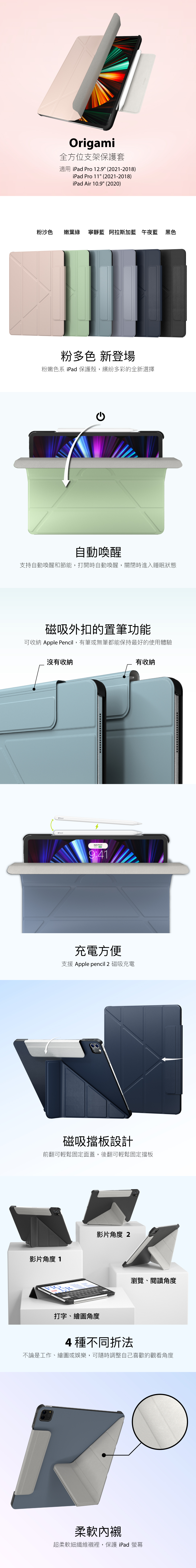 Switcheasy Origami iPad Pro 12.9 吋 全方位支架保護套・2021 - 2018 共用款,內建折疊支架,提供 4 種不同的折疊及支撐方式,可任意變換使用角度,滿足多種情境。翻蓋式自動喚醒功能,滿足 iPad 重度使用者的日常所需。磁吸外扣的置筆設計,方便收納觸控筆的同時也能保持精簡外觀。