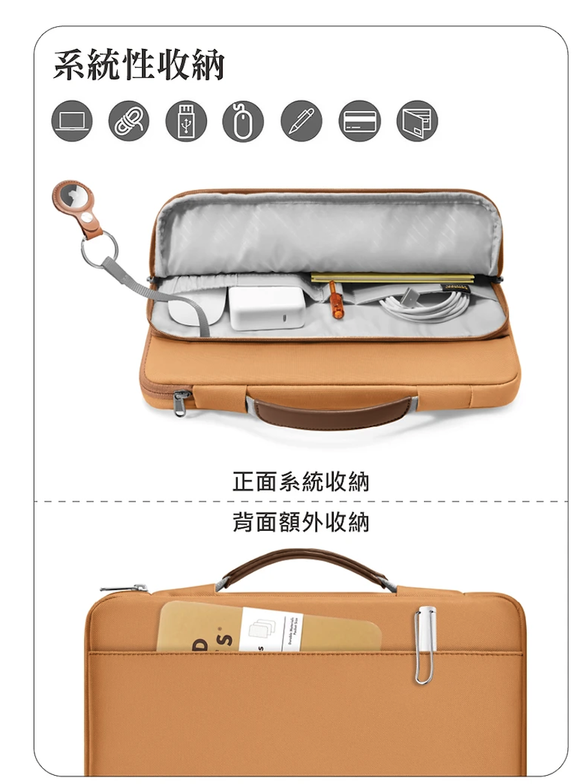除了中心的主袋, Tomtoc 此產品包另外增加了前方的大型拉鍊副袋,提供了更多的收納空間,內部包含了多樣的文具小袋、大小口袋和彈性收藏袋。Tomtoc 筆電包讓您更輕易的掌理數位生活。