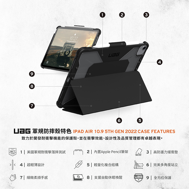 *此賣場為 UAG iPad Air 5 全透款保護殼 *請認明原廠公司貨 *本公司為授權經銷商 * 建議使用UAG iPad 專用保護貼* |