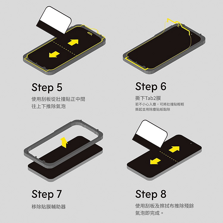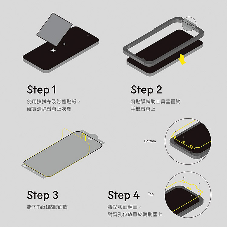 保護貼x1、超纖拭鏡布x1、氣泡刮卡x1及拭塵貼x1、貼膜輔助器僅x1 (相容於 iPhone 7 以上)